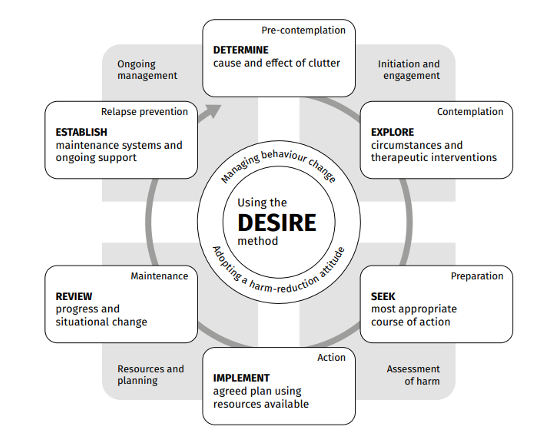DESIRE is a methodological framework for managing behaviour change whilst adopting a harm reduction attitude to extreme clutter situations.
